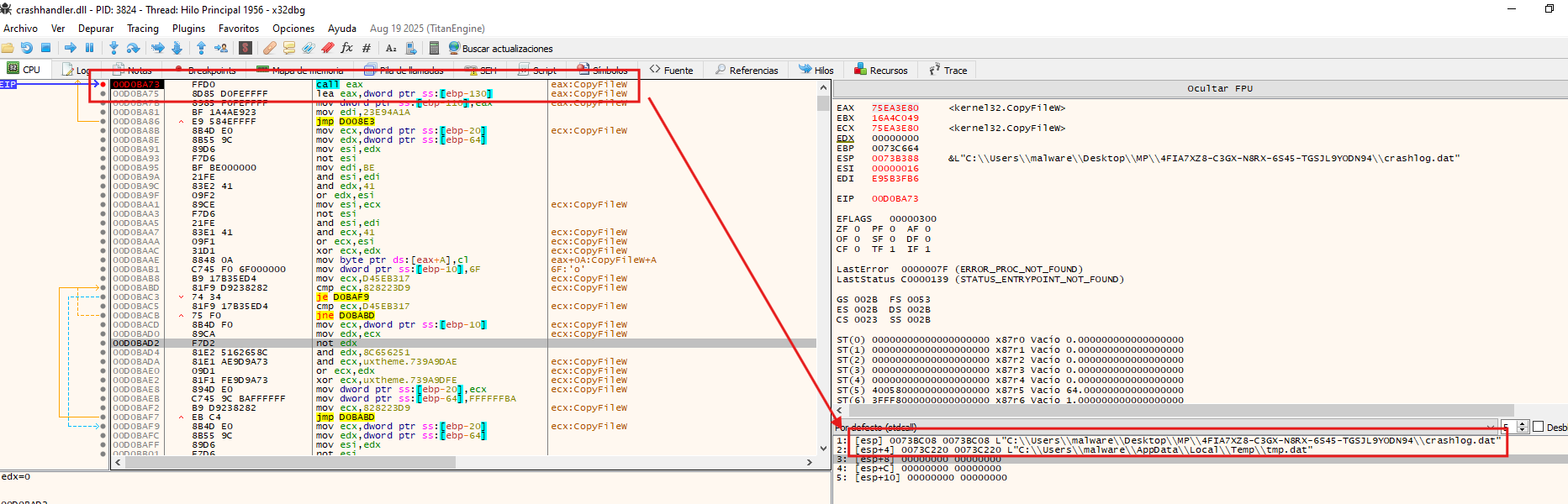 As part of its cleanup routine, the malware first attempts to delete any pre-existing instance of tmp.dat in C:\Users\<User>\AppData\Local\Temp, ensuring a clean write, before dropping a fresh copy of crashlog.dat under that name, only to delete it shortly after. The purpose of the subsequent deletion remains unclear.