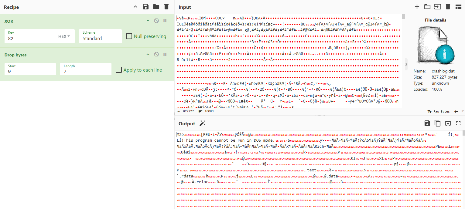 The file crashlog.dat begins with a self-contained XOR decryption stub, keyed on 0x82, responsible for decrypting the remainder of the payload in-place prior to execution.
