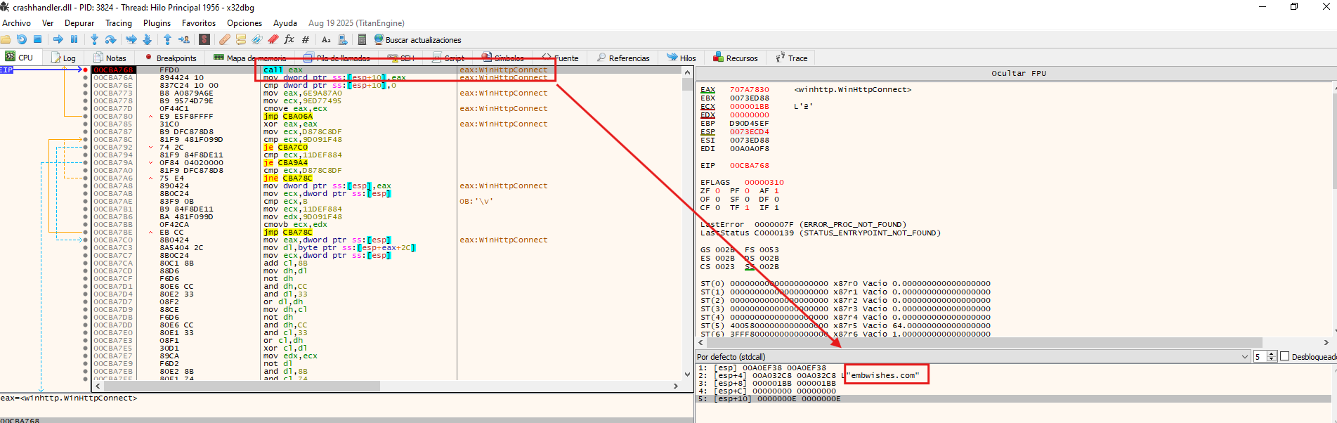 Following the information gathering phase, the malware prepares to establish a connection with its C2 server. To do so, it first queries Software\Microsoft\Windows\CurrentVersion\Internet Settings\ProxyEnable and Software\Microsoft\Windows\CurrentVersion\Internet Settings\ProxyServer to determine whether a proxy configuration is in place. Once resolved, it initiates an initial beacon to the C2 (embwishes[.]com), signaling that the implant is active on the compromised host.
