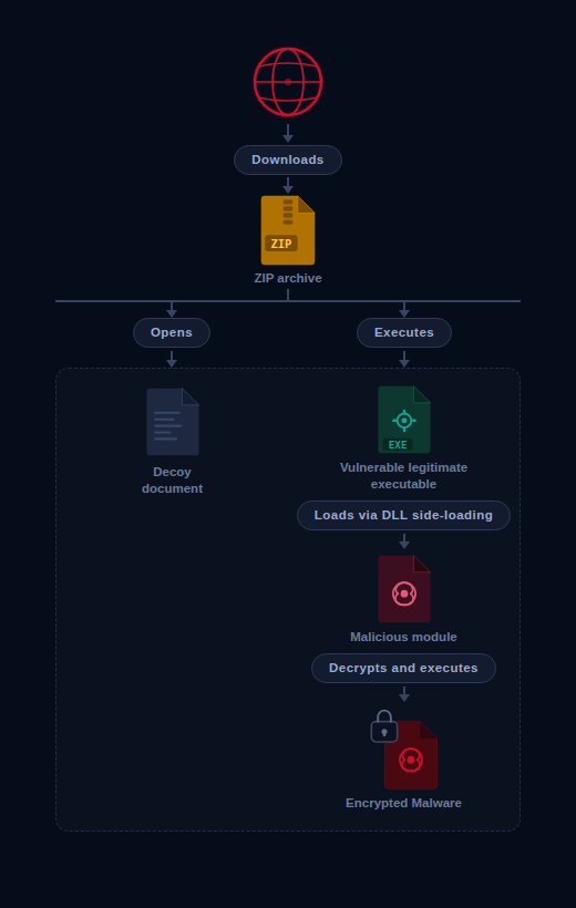 A campaign targeting European diplomatic entities was identified during February 2026, affecting organizations in several countries including Italy, Latvia, and France.The attack chain begins with the download of a ZIP archive from a remote URL, most likely delivered through a phishing email. Inside the archive, the initial stage consists of a malicious LNK file themed around BRICS-related information to lure the victim.Notably, the LNK file leverages a recently reported Windows Shortcut vulnerability that allows attackers to trigger malicious behavior when the shortcut is processed. More details about this vulnerability can be found in the following research by Trend Micro Windows Shortcut Zero-Day Exploit – Trend Micro.Once executed, the LNK file triggers a sequence of actions that ultimately leads to the side-loading of a malicious DLL using a legitimate Steam executable.