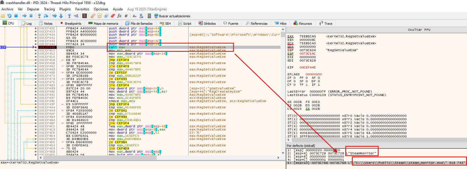 To establish persistence, the malware creates a registry value named SteamMonitor under HKCU\Software\Microsoft\Windows\CurrentVersion\Run, setting its data to C:\Users\Public\Steam\steam_monitor.exe 918 743, ensuring the payload is executed automatically on every user logon.
